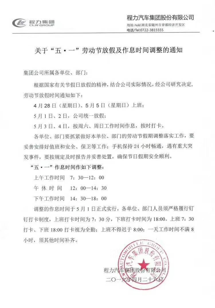2019湖北程力集團(tuán)五一放假安排和作息時(shí)間調(diào)整通知