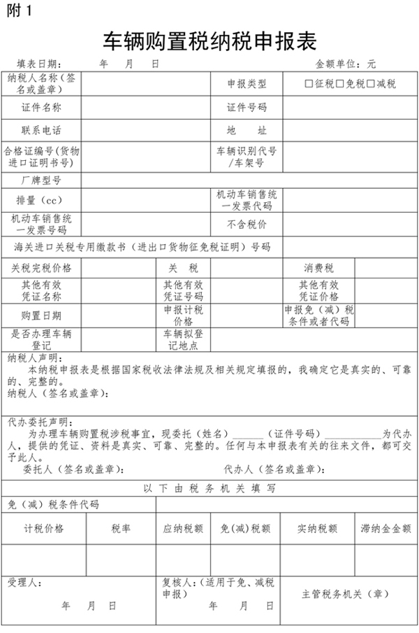 《車輛購置稅納稅申報表》填表說明 1.本表由車輛購置稅納稅人在辦理納(免、減)稅申報時填寫(打印),由納稅人簽章確認(rèn)。 2.“納稅人名稱”欄,填寫辦理申報時提供的納稅人證件上注明的名稱。 3.“證件名稱”欄,單位納稅人填寫《統(tǒng)一社會信用代碼證書》或者《營業(yè)執(zhí)照》或者其他有效機(jī)構(gòu)證明;個人納稅人填寫《居民身份證》或者其他身份證明名稱。 4.“證件號碼”欄,填寫“證件名稱”欄填寫的證件的號碼。 5.“合格證編號(貨物進(jìn)口證明書號)”“車輛識別代號/車架號”“廠牌型號”“排量(cc)”欄,分別按照車輛合格證或者《中華人民共和國海關(guān)貨物進(jìn)口證明書》或者《中華人民共和國海關(guān)監(jiān)管車輛進(jìn)(出)境領(lǐng)(銷)牌照通知書》或者《沒收走私汽車、摩托車證明書》中對應(yīng)的編號、車輛識別代號/車架號、車輛品牌和車輛型號、排量填寫。 6.“機(jī)動車銷售統(tǒng)一發(fā)票代碼”“機(jī)動車銷售統(tǒng)一發(fā)票號碼”“不含稅價”欄,分別按照機(jī)動車銷售統(tǒng)一發(fā)票相應(yīng)項目填寫。 7.下列欄次由進(jìn)口自用車輛的納稅人填寫: (1)“海關(guān)進(jìn)口關(guān)稅專用繳款書(進(jìn)出口貨物征免稅證明)號碼”欄,填寫《海關(guān)進(jìn)口關(guān)稅專用繳款書》中注明的號碼;免征關(guān)稅應(yīng)稅車輛填寫《進(jìn)出口貨物征免稅證明》中注明的編號。 (2)“關(guān)稅完稅價格”欄,通過《海關(guān)進(jìn)口關(guān)稅專用繳款書》《海關(guān)進(jìn)口消費稅專用繳款書》《海關(guān)進(jìn)口增值稅專用繳款書》或者其他資料進(jìn)行采集,順序如下: ①《海關(guān)進(jìn)口關(guān)稅專用繳款書》中注明的關(guān)稅完稅價格; ② 在免關(guān)稅的情況下,通過《海關(guān)進(jìn)口消費稅專用繳款書》中注明的完稅價格和消費稅稅額計算關(guān)稅完稅價格; ③ 在免關(guān)稅和免或者不征消費稅的情況下,采用《海關(guān)進(jìn)口增值稅專用繳款書》中注明的完稅價格; ④ 在關(guān)稅、消費稅和增值稅均免征或者不征的情況下,通過其他資料采集關(guān)稅完稅價格。 (3)“關(guān)稅”欄,填寫《海關(guān)進(jìn)口關(guān)稅專用繳款書》中注明的關(guān)稅稅額。 (4)“消費稅”欄,填寫《海關(guān)進(jìn)口消費稅專用繳款書》中注明的消費稅稅額。 8.“其它有效憑證名稱”“其它有效憑證號碼”“其它有效憑證價格”欄由未取得機(jī)動車銷售統(tǒng)一發(fā)票且非進(jìn)口自用的納稅人按取得的相應(yīng)證明資料內(nèi)容填寫。 9.“購置日期”欄,填寫機(jī)動車銷售統(tǒng)一發(fā)票或者海關(guān)進(jìn)口關(guān)稅專用繳款書(進(jìn)出口貨物征免稅證明)或者其他有效憑證的開具或者生效日期。 10.“申報計稅價格”欄,分別按照下列要求填寫: (1)境內(nèi)購置車輛,按照車輛相關(guān)憑證的不含稅價填寫; (2)進(jìn)口自用車輛,按計稅價格填寫,計稅價格=關(guān)稅完稅價格+關(guān)稅+消費稅; 11.“申報免(減)稅條件或者代碼”欄,分別按照下列情形填寫文字或者代碼: A.外國駐華使館、領(lǐng)事館和國際組織駐華機(jī)構(gòu)及其有關(guān)人員自用的車輛,免稅; B.中國人民解放軍和中國人民武裝警察部隊列入裝備訂貨計劃的車輛,免稅; C.懸掛應(yīng)急救援專用號牌的國家綜合性消防救援車輛,免稅; D.設(shè)有固定裝置的非運輸專用作業(yè)車輛,免稅; E.城市公交企業(yè)購置的公共汽電車輛,免稅; F.國務(wù)院規(guī)定予以免稅或者減稅的其他情形的,按照規(guī)定免稅或者減稅。 12.“是否辦理車輛登記”欄,如填寫“是”,則“車輛擬登記地點”欄應(yīng)填寫具體縣(市、區(qū))。 13.本表一式二份(一車一表),一份由納稅人留存,一份由主管稅務(wù)機(jī)關(guān)留存。