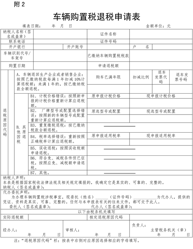 《車輛購置稅退稅申請表》填表說明 1.本表由車輛購置稅納稅人在辦理退稅申請時填寫(打印),由納稅人簽章確認(rèn)。 2.“納稅人名稱”欄,填寫辦理退稅申報時提供的納稅人證件上注明的名稱。 3.“證件名稱”欄,單位納稅人填寫《統(tǒng)一社會信用代碼證書》或者《營業(yè)執(zhí)照》或者其他有效機(jī)構(gòu)證明;個人納稅人填寫《居民身份證》或者其他身份證明名稱。 4.“證件號碼”欄,填寫“證件名稱”欄填寫的證件的號碼。 5.“開戶銀行”“賬號”“戶名”欄,填寫納稅人用來接收國庫退稅稅款的開戶銀行、賬號及開戶名稱。 6.“車輛識別代號/車架號”欄,按車輛合格證或者《中華人民共和國海關(guān)貨物進(jìn)口證明書》或者《中華人民共和國海關(guān)監(jiān)管車輛進(jìn)(出)境領(lǐng)(銷)牌照通知書》或者《沒收走私汽車、摩托車證明書》中對應(yīng)的車輛識別代號(車架號)填寫。 7.“已繳納車輛購置稅稅款”欄,填寫主管稅務(wù)機(jī)關(guān)開具的車輛購置稅繳稅憑證上注明的繳稅金額。 8.“購置日期”欄,填寫機(jī)動車銷售統(tǒng)一發(fā)票(或者有效憑證)上注明的開票日期。 9.“申請退稅額”欄,填寫納稅人向稅務(wù)機(jī)關(guān)申請的退稅金額。 10.“退稅原因代碼”欄,按表中右側(cè)對應(yīng)原因選擇相應(yīng)的字母填寫。 11.本表(一車一表)一式三份,一份由納稅人留存;一份由國庫留存;一份由主管稅務(wù)機(jī)關(guān)留存。