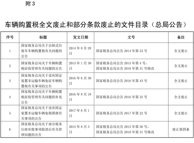 為落實《中華人民共和國車輛購置稅法》(以下簡稱《車購稅法》),規(guī)范車輛購置稅征收管理,現(xiàn)就有關(guān)事項公告如下: 一、車輛購置稅實行一車一申報制度。 二、《車購稅法》第六條第四項所稱的購置應(yīng)稅車輛時相關(guān)憑證,是指原車輛所有人購置或者以其他方式取得應(yīng)稅車輛時載明價格的憑證。無法提供相關(guān)憑證的,參照同類應(yīng)稅車輛市場平均交易價格確定其計稅價格。無同類應(yīng)稅車輛市場平均交易價格的,由稅務(wù)機(jī)關(guān)依據(jù)《中華人民共和國稅收征收管理法》(以下簡稱《稅收征管法》)及其實施細(xì)則核定其應(yīng)納稅額。 原車輛所有人為車輛生產(chǎn)或者銷售企業(yè),未開具機(jī)動車銷售統(tǒng)一發(fā)票的,按照車輛生產(chǎn)或者銷售同類應(yīng)稅車輛的銷售價格確定應(yīng)稅車輛的計稅價格。無同類應(yīng)稅車輛銷售價格以及同類應(yīng)稅車輛無銷售價格的,按照組成計稅價格確定應(yīng)稅車輛的計稅價格。 三、購置應(yīng)稅車輛的納稅人,應(yīng)當(dāng)?shù)较铝械攸c申報納稅: (一)需要辦理車輛登記的,向車輛登記地的主管稅務(wù)機(jī)關(guān)申報納稅; (二)不需要辦理車輛登記的,單位納稅人向其機(jī)構(gòu)所在地主管稅務(wù)機(jī)關(guān)申報納稅,個人納稅人向其戶籍所在地或者經(jīng)常居住地的主管稅務(wù)機(jī)關(guān)申報納稅。 四、《車購稅法》第十二條所稱納稅義務(wù)發(fā)生時間,按照下列情形確定: (一)購買自用應(yīng)稅車輛的為購買之日,即車輛相關(guān)價格憑證的開具日期; (二)進(jìn)口自用應(yīng)稅車輛的為進(jìn)口之日,即《海關(guān)進(jìn)口增值稅專用繳款書》或者其他有效憑證的開具日期; (三)自產(chǎn)、受贈、獲獎或者以其他方式取得并自用應(yīng)稅車輛的為取得之日,即合同、法律文書或者其他有效憑證的生效或者開具日期。 五、納稅人辦理納稅申報時應(yīng)當(dāng)如實填報《車輛購置稅納稅申報表》(附件一,以下簡稱《納稅申報表》),同時提供車輛合格證明和車輛相關(guān)價格憑證。 六、納稅人在辦理車輛購置稅免稅、減稅時,除按本公告第五條規(guī)定提供資料外,還應(yīng)當(dāng)根據(jù)不同的免減稅項目,分別提供以下資料的原件或者復(fù)印件: (一)外國駐華使館、領(lǐng)事館和國際組織駐華機(jī)構(gòu)及其有關(guān)人員自用車輛,提供機(jī)構(gòu)證明和外交部門出具的身份證明。 (二)城市公交企業(yè)購置的公共汽電車輛,提供所在地縣級以上(含縣級)交通運輸主管部門出具的公共汽電車輛認(rèn)定表。 (三)懸掛應(yīng)急救援專用號牌的國家綜合性消防救援車輛,提供中華人民共和國應(yīng)急管理部批準(zhǔn)的相關(guān)文件。 (四)回國服務(wù)的在外留學(xué)人員購買的自用國產(chǎn)小汽車,提供海關(guān)核發(fā)的《中華人民共和國海關(guān)回國人員購買國產(chǎn)汽車準(zhǔn)購單》。 (五)長期來華定居專家進(jìn)口自用小汽車,提供國家外國專家局或者其授權(quán)單位核發(fā)的專家證或者A類和B類《外國人工作許可證》。 七、免稅、減稅車輛因轉(zhuǎn)讓、改變用途等原因不再屬于免稅、減稅范圍的,納稅人在辦理納稅申報時,應(yīng)當(dāng)如實填報《納稅申報表》。發(fā)生二手車交易行為的,提供二手車銷售統(tǒng)一發(fā)票;屬于其他情形的,按照相關(guān)規(guī)定提供申報材料。 八、已經(jīng)繳納車輛購置稅的,納稅人向原征收機(jī)關(guān)申請退稅時,應(yīng)當(dāng)如實填報《車輛購置稅退稅申請表》(附件二,以下簡稱《退稅申請表》),除提供納稅人身份證明外,還應(yīng)當(dāng)按照下列情況分別提供以下資料: (一)車輛退回生產(chǎn)企業(yè)或者銷售企業(yè)的,提供生產(chǎn)企業(yè)或者銷售企業(yè)開具的退車證明和退車發(fā)票。 (二)其他依據(jù)法律法規(guī)規(guī)定應(yīng)當(dāng)退稅的,根據(jù)具體情形提供相關(guān)資料。 九、納稅人應(yīng)如實申報應(yīng)稅車輛的計稅價格。 納稅人沒有編造虛假計稅依據(jù)的,稅務(wù)機(jī)關(guān)按照其申報的計稅價格征收稅款;納稅人編造虛假計稅依據(jù)的,稅務(wù)機(jī)關(guān)依照《稅收征管法》及其實施細(xì)則的相關(guān)規(guī)定處理。 十、稅務(wù)機(jī)關(guān)追繳稅款時,納稅人無法按照規(guī)定提供申報資料的,可以依據(jù)司法、審計、財政等有關(guān)機(jī)關(guān)的文書,為其辦理補稅手續(xù)。 十一、本公告要求納稅人提供的資料,稅務(wù)機(jī)關(guān)能夠通過政府信息共享等手段獲取相關(guān)資料信息的,納稅人不再提交。 十二、本公告所稱的納稅人身份證明:單位納稅人為《統(tǒng)一社會信用代碼證書》或者營業(yè)執(zhí)照或者其他有效機(jī)構(gòu)證明,個人納稅人為居民身份證或者居民戶口簿或者入境的身份證件。 本公告所稱車輛合格證明為整車出廠合格證或者車輛電子信息單。 本公告所稱車輛相關(guān)價格憑證,境內(nèi)購置車輛為機(jī)動車銷售統(tǒng)一發(fā)票或者其他有效憑證,進(jìn)口自用車輛為《海關(guān)進(jìn)口關(guān)稅專用繳款書》或者海關(guān)進(jìn)出口貨物征免稅證明。屬于應(yīng)征消費稅車輛的還包括《海關(guān)進(jìn)口消費稅