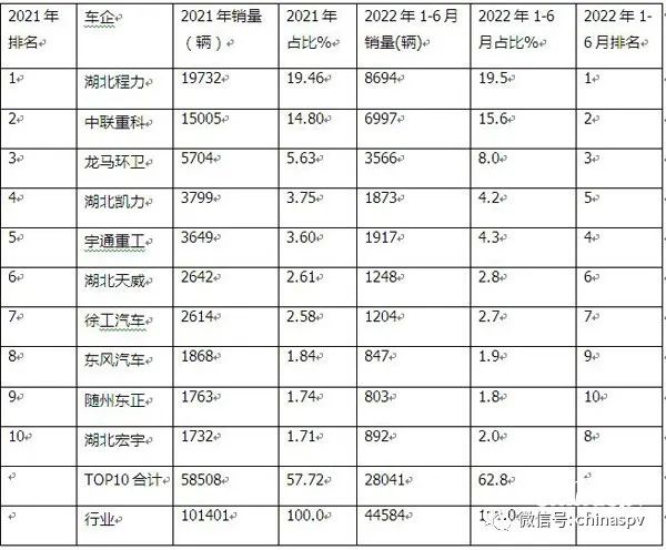 2022年上半年環(huán)衛(wèi)車(chē)市場(chǎng)趨勢(shì):湖北程力、福建龍馬、中聯(lián)重科居前三,新能源專(zhuān)用汽車(chē)表現(xiàn)搶眼。環(huán)衛(wèi)車(chē)屬于商用車(chē)行業(yè)中專(zhuān)用車(chē)類(lèi)的一個(gè)小眾市場(chǎng),包括各類(lèi)垃圾車(chē)、灑水車(chē)、洗掃車(chē)、吸污車(chē)等。近年來(lái)隨著經(jīng)濟(jì)的發(fā)展與人民生活水平的不斷提高,特別是近期受疫情的影響,人們對(duì)環(huán)境衛(wèi)生質(zhì)量的要求越來(lái)越高,同時(shí)隨著垃圾分類(lèi)、城鎮(zhèn)化、農(nóng)村環(huán)境整治等利好政策得到有效落地執(zhí)行,將促進(jìn)垃圾車(chē)、清掃車(chē)等環(huán)衛(wèi)車(chē)輛需求呈穩(wěn)定上升趨勢(shì),因此環(huán)衛(wèi)車(chē)市場(chǎng)已引起業(yè)內(nèi)的關(guān)注。但由于受疫情影響,今年上半年環(huán)衛(wèi)車(chē)市場(chǎng)也遭遇下滑。 根據(jù)終端上牌信息,2022年6月環(huán)衛(wèi)車(chē)銷(xiāo)量8629輛,環(huán)比(今年5月環(huán)衛(wèi)車(chē)銷(xiāo)量8019輛)增長(zhǎng)7.6%,同比(去年6月銷(xiāo)量10385輛,見(jiàn)截圖1)下降16.9%,2022年1-6月環(huán)衛(wèi)車(chē)?yán)塾?jì)銷(xiāo)售44584輛,同比(2021年前6月累計(jì)銷(xiāo)售54801輛)下降18.6%,累計(jì)降幅比1-5月(1-5月累計(jì)同比下降19%)縮窄近0.4個(gè)百分點(diǎn)。 截圖1,2021年各月環(huán)衛(wèi)車(chē)銷(xiāo)量(數(shù)據(jù)來(lái)源:汽車(chē)智庫(kù)) 按功能用途劃分,2022年6月及前6月,環(huán)衛(wèi)車(chē)中垃圾車(chē)銷(xiāo)量均為最多,分別銷(xiāo)售3133輛和累計(jì)銷(xiāo)售16413輛,占據(jù)環(huán)衛(wèi)車(chē)的市場(chǎng)份額分別為36.3%和36.2%;其次是灑水車(chē);再次是吸污車(chē);第四是洗掃車(chē); 在2022年6月及前6月環(huán)衛(wèi)車(chē)銷(xiāo)量最大的垃圾車(chē)市場(chǎng)中,車(chē)廂可卸式垃圾車(chē)占比均超半壁江山,領(lǐng)跑垃圾車(chē)各細(xì)分車(chē)型銷(xiāo)量; 按燃料種類(lèi)劃分,今年上半年柴油類(lèi)環(huán)衛(wèi)車(chē)仍占主體,但主體地位有減弱趨勢(shì);新能源環(huán)衛(wèi)車(chē)?yán)塾?jì)銷(xiāo)售2240輛,市場(chǎng)占比超5%,且占比比2021年增加1.32個(gè)百分點(diǎn),領(lǐng)漲環(huán)衛(wèi)車(chē)各細(xì)分市場(chǎng),表現(xiàn)搶眼,其中新能源自卸式垃圾車(chē)?yán)塾?jì)銷(xiāo)售472輛,領(lǐng)領(lǐng)跑新能源環(huán)衛(wèi)車(chē)各細(xì)分車(chē)型; 從今年上半年環(huán)衛(wèi)車(chē)的區(qū)域市場(chǎng)流向看,湖北、山東、廣東居前三; 從今年上半年企業(yè)具體表現(xiàn)看,湖北程力、長(zhǎng)沙中聯(lián)重科、福建龍馬環(huán)衛(wèi)車(chē)居前三。 下面對(duì)今年上半年環(huán)衛(wèi)車(chē)市場(chǎng)特點(diǎn)進(jìn)行解讀。 特點(diǎn)一:按功能用途劃分,各類(lèi)垃圾車(chē)銷(xiāo)量占比超三之一,居榜首 表1,2022年6月及1-6月各類(lèi)環(huán)衛(wèi)車(chē)銷(xiāo)量同比、占比及占比同比增減(數(shù)據(jù)來(lái)源:汽車(chē)智庫(kù)及終端上牌信息) 2022年上半年環(huán)衛(wèi)車(chē)市場(chǎng)趨勢(shì):湖北程力、福建龍馬、中聯(lián)重科居前三,新能源專(zhuān)用汽車(chē)表現(xiàn)搶眼。 ---各類(lèi)環(huán)衛(wèi)車(chē)單月和累計(jì)分別銷(xiāo)售3133輛和16143輛,占比分別為36.3%和36.2%,均超環(huán)衛(wèi)車(chē)整體市場(chǎng)的三分之一份額,均居第一,說(shuō)明垃圾車(chē)是環(huán)衛(wèi)車(chē)中需求最多的細(xì)分車(chē)型; ---灑水車(chē)單月和累計(jì)分別銷(xiāo)售2261輛和11742輛,占比分別是26.2%和26.3%,均居第二; ---吸污車(chē)單月和累計(jì)分別銷(xiāo)售1950輛和10161輛,占比分別為22.6%和22.8%,居第三; ---清掃車(chē)單月和累計(jì)銷(xiāo)量分別為1285輛和6538輛,占比分別為14.89%和14.67%,居第四,是環(huán)衛(wèi)車(chē)中占比相對(duì)較小的細(xì)分車(chē)型。 總之,無(wú)論是今年6月還是今年上半年,垃圾車(chē)占比均超三分之一,成為環(huán)衛(wèi)車(chē)中占比最高、最受市場(chǎng)青睞的細(xì)分車(chē)型。 特點(diǎn)二:車(chē)廂可卸式垃圾車(chē)占比超半壁江山,領(lǐng)跑垃圾車(chē)市場(chǎng) 表2,根據(jù)終端上牌信息,2022年6月及前6月各類(lèi)垃圾車(chē)銷(xiāo)量、占比統(tǒng)計(jì): 上表可見(jiàn),2022年6月及1-6月各類(lèi)垃圾車(chē)銷(xiāo)量及占比呈現(xiàn)以下特點(diǎn): ---車(chē)廂可自卸式垃圾車(chē)單月及累計(jì)銷(xiāo)量分別為1660輛和8158輛,占比分別為50.1%和50.5%,占比均超半壁江山,均居第一,領(lǐng)跑各類(lèi)垃圾車(chē)市場(chǎng),說(shuō)明車(chē)廂可卸式垃圾車(chē)最受垃圾車(chē)市場(chǎng)歡迎; ---壓縮式垃圾車(chē)單月和累計(jì)銷(xiāo)量分別為1098輛和5688輛,占比分別為35.1%和35.2%,均居第二; ---密封式垃圾車(chē)和拉臂式垃圾車(chē)無(wú)論是單月和累計(jì)銷(xiāo)量占比均很小; ---其他垃圾車(chē)單月和累計(jì)銷(xiāo)量分別為395輛和2005輛,主要包括各種倉(cāng)廚垃圾車(chē)、掛桶式垃圾車(chē)等,占比分別為12.6%和12.5%。 特點(diǎn)三:新能源環(huán)衛(wèi)車(chē)占比增加最多,表現(xiàn)搶眼 截圖2,2019年—2021年各類(lèi)動(dòng)力環(huán)衛(wèi)車(chē)銷(xiāo)量占比(來(lái)源:汽車(chē)智庫(kù)平臺(tái)) 表3,根據
