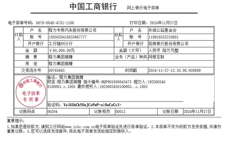 2024年11月27日,程力汽車集團旗下核心企業----程力專用汽車股份有限公司,向東潤公益基金會捐款60000元,用于弘揚公益精神和助力國家科學人才培育,以及賑災濟難、撫貧濟困、獎教助學,改善經濟欠發達地區青少年的生活、學習條件,幫助其提高自身發展能力,為國家培養具有國際競爭力的新一代人才做貢獻。