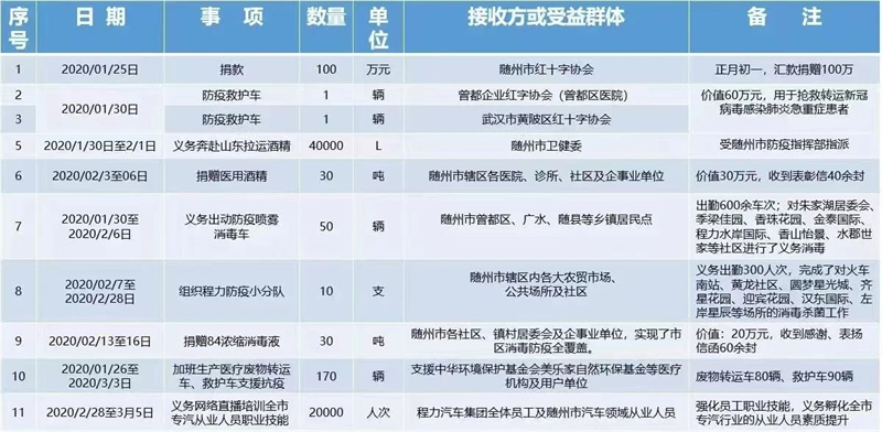 程力汽車集團自2004年創立以來,就踐行社會責任倡導公益事業,在創建世界一流專汽領先企業的過程中,始終如一的把“精準扶貧”、“抗疫抗洪、搶險救災”、“萬企興萬村”,以及扶危濟困、關愛孤寡老人、殘疾兒童,捐款捐物等公益事業作為回報社會的重要途徑先后對宣恩縣巴楚風印務公司、恩施移民社區,以及隨州養老院、殘疾孤兒院、萬店鎮新東村扶貧,隨縣柳林鎮洪災、廣水雙塘村鄉村振興,抗疫捐款捐物、河南鄭州洪災、甘肅積石山地震、河北涿州水災、湖南岳陽潰壩搶險,都給予援助救急解困,累計投入數千萬公益資金。