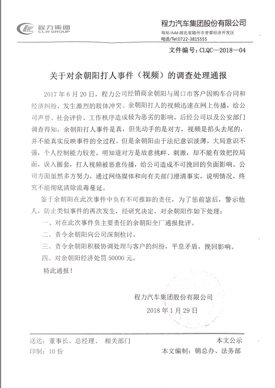 湖北程力關(guān)于對于余朝陽打人事件視頻的調(diào)查處理通報