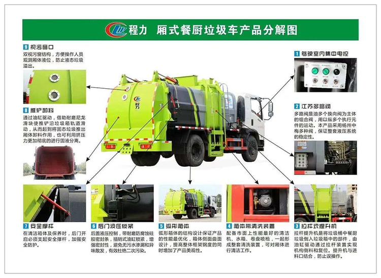 湖北程力國六東風天錦10-12方餐廚垃圾車(方罐)程力威牌CLW5160TCA6SL型餐廚垃圾車技術參數: