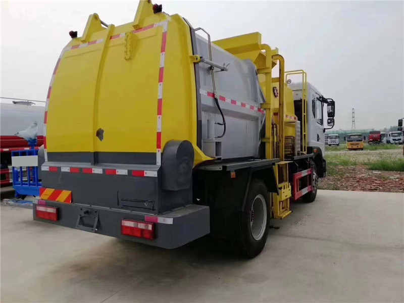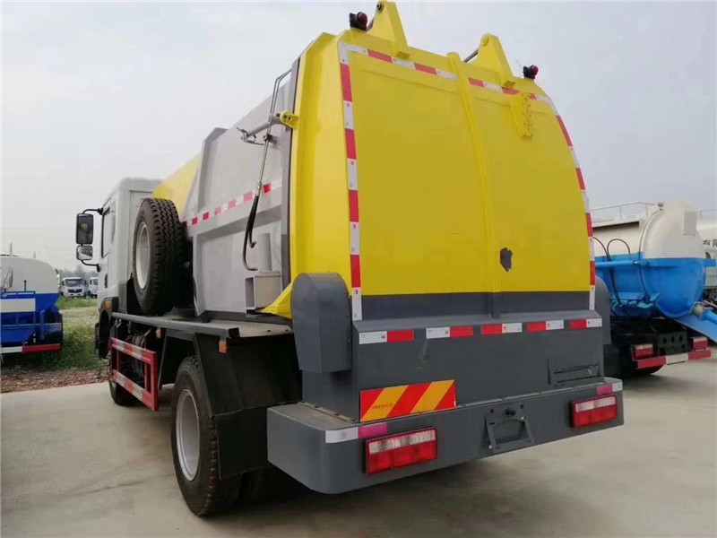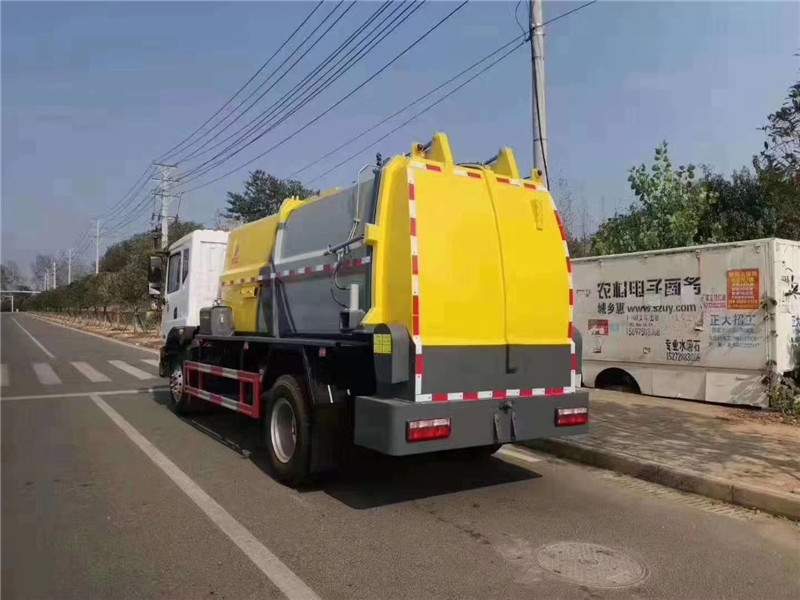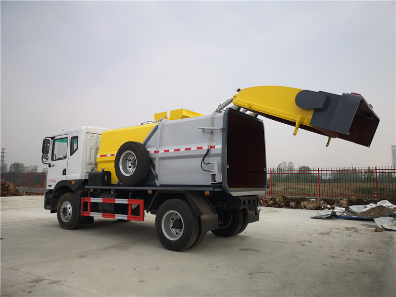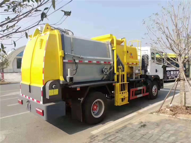 c、罐體容積8.5-10方,罐體帶舉升功能,后門液壓控制開啟關閉,帶液壓鎖緊功能,拉桿提升機聯(lián)動頂蓋完美設計,收集時滴水不漏。提升架可掛 120L/240L 標準塑料垃圾桶