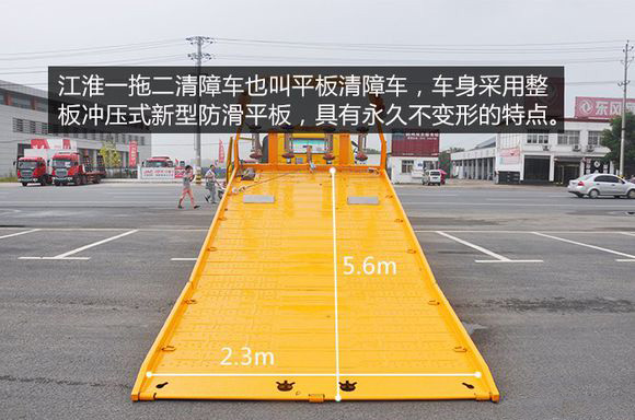 江淮平板一拖二清障車也叫江淮平板清障車,車身采用整板沖壓式新型防滑平板,具有永久不變形的特點(diǎn)。平板長5.6米,寬2.3米,平板承載量為4噸,一般的家用轎車都能輕松拖起。