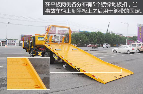 在平板兩側(cè)各分布有5個(gè)鍍鋅地板扣,當(dāng)事故車輛上到平板上之后用于綁帶的固定。