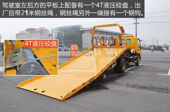 駕駛室左后方的平板上配備有一個(gè)4T液壓絞盤,出廠自帶25米鋼絲繩,鋼絲繩另外一端接有一個(gè)鋼鉤,便于拖車時(shí)進(jìn)行牽引。