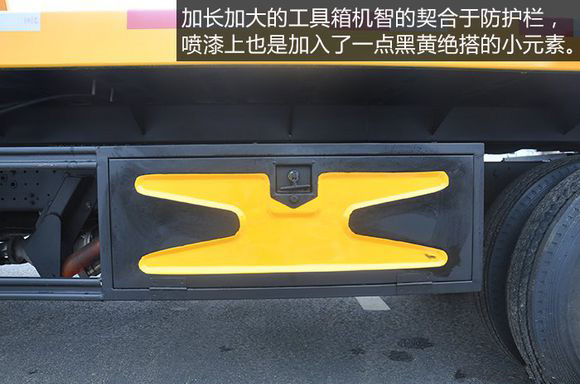 加長加大的工具箱機(jī)智的契合于防護(hù)欄,噴漆上也是加入了一點(diǎn)黑黃絕搭的小元素,絲毫不顯突兀,完美的融入整車色調(diào)。