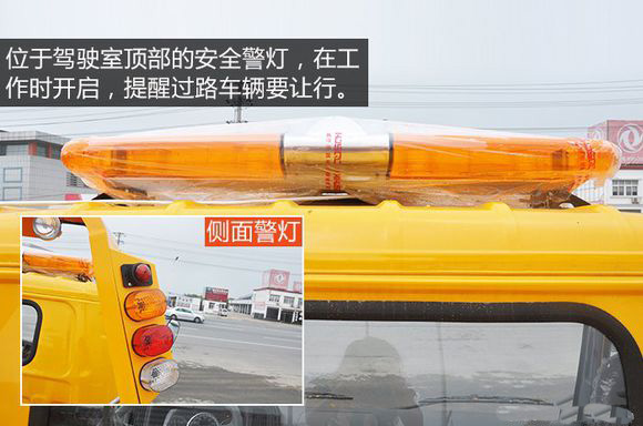 位于駕駛室頂部的安全警燈,在工作時(shí)開啟,提醒過路車輛要讓行,另外平板上方的架子左右各加裝有長排24V電子安全警示燈,進(jìn)一步的加強(qiáng)了安全性。