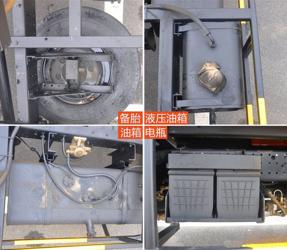 我們再來看看底盤上各零部件的分配,電瓶置于駕駛室左后方,與之對應(yīng)的右后方是油箱,油箱后方則是液壓油箱,緊隨其后的就是備胎。各零部件在不影響美觀的前提下,分配合理,實(shí)用性也很強(qiáng)。