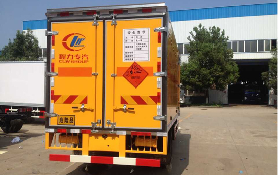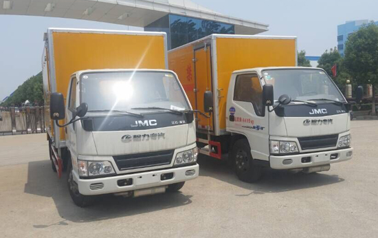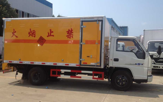 廂體頂部封閉,不可開啟, 該車隨底盤選裝駕駛室前面罩,前保險桿,前組合燈具,前霧燈;選裝液壓后尾板,尾板收起狀態水平長度300mm,運輸品名:黑火藥,壓縮黑火藥,炸藥,雷管,煙花爆竹等,類項號:1.1B,1.1D,1.1G,1.2G,1.3G,1.4G 等,廂體側面板選擇開百葉窗,選裝不帶側門,側門型式及位置,選裝不開側門時整車寬度1950mm,車輛類別EX/Ⅱ,選裝開側門時整車寬度2010mm,選裝廂體結構造型,選裝瓦楞板及平面廂體,廂體顏色可變化,文字噴涂位置可變化. ABS系統型號:APG3550500A,ABS系統生產廠家:浙江亞太機電股份有限公司.安裝限速裝置,最高車速80,僅選用安裝前置排氣管,前輪安裝盤式制動器及子午線輪胎的底盤,安裝具有衛星定位功能的行駛記錄儀.側面及后下部防護裝置材料為Q235,與車架采用焊接連接.后下部防護裝置斷面尺寸(mm):100×50,離地高度:450mm,JX493ZLQ5,JX493ZLQ5A發動機油耗均為13.0L/100km