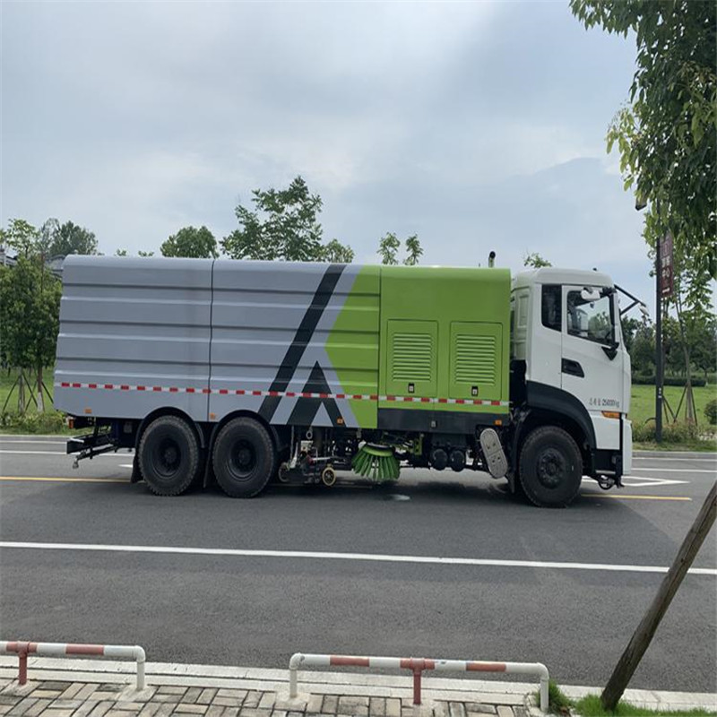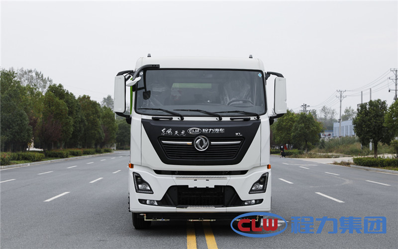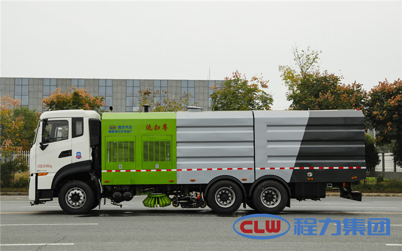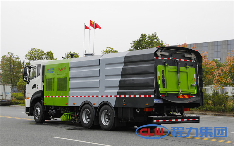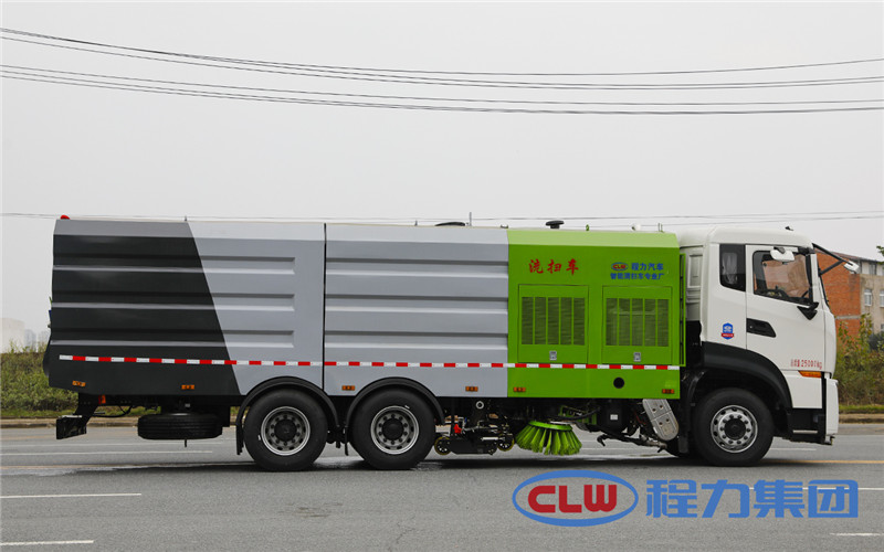 湖北程力國六東風天龍后雙橋大型洗掃采用東風天龍DFH1250D4型國二類汽車底盤改裝,加裝副發動機、風機、高壓水泵、清水箱、垃圾箱、左右立掃、帶噴水桿的寬吸嘴、低壓沖洗系統、掃盤降塵系統、液壓系統、專用裝置電控系統和副車架等改裝而成。